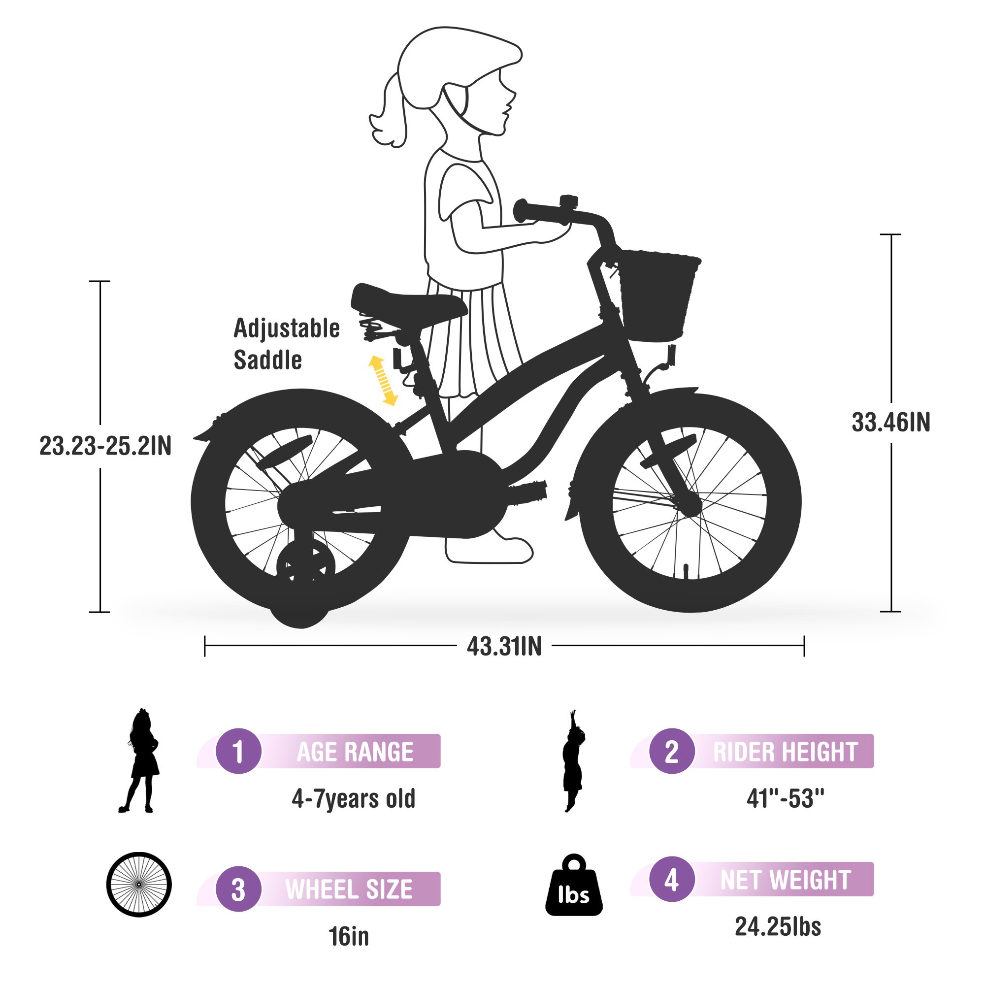 Product DetailsBike Type16 inch Girls BikeAge Range (Description)4-7 years oldNumber of SpeedSingle SpeedWheel Size16 inch wheelFrame MaterialSteel FrameSuspension TypeNOFeaturesWith Training wheelsColorPurple