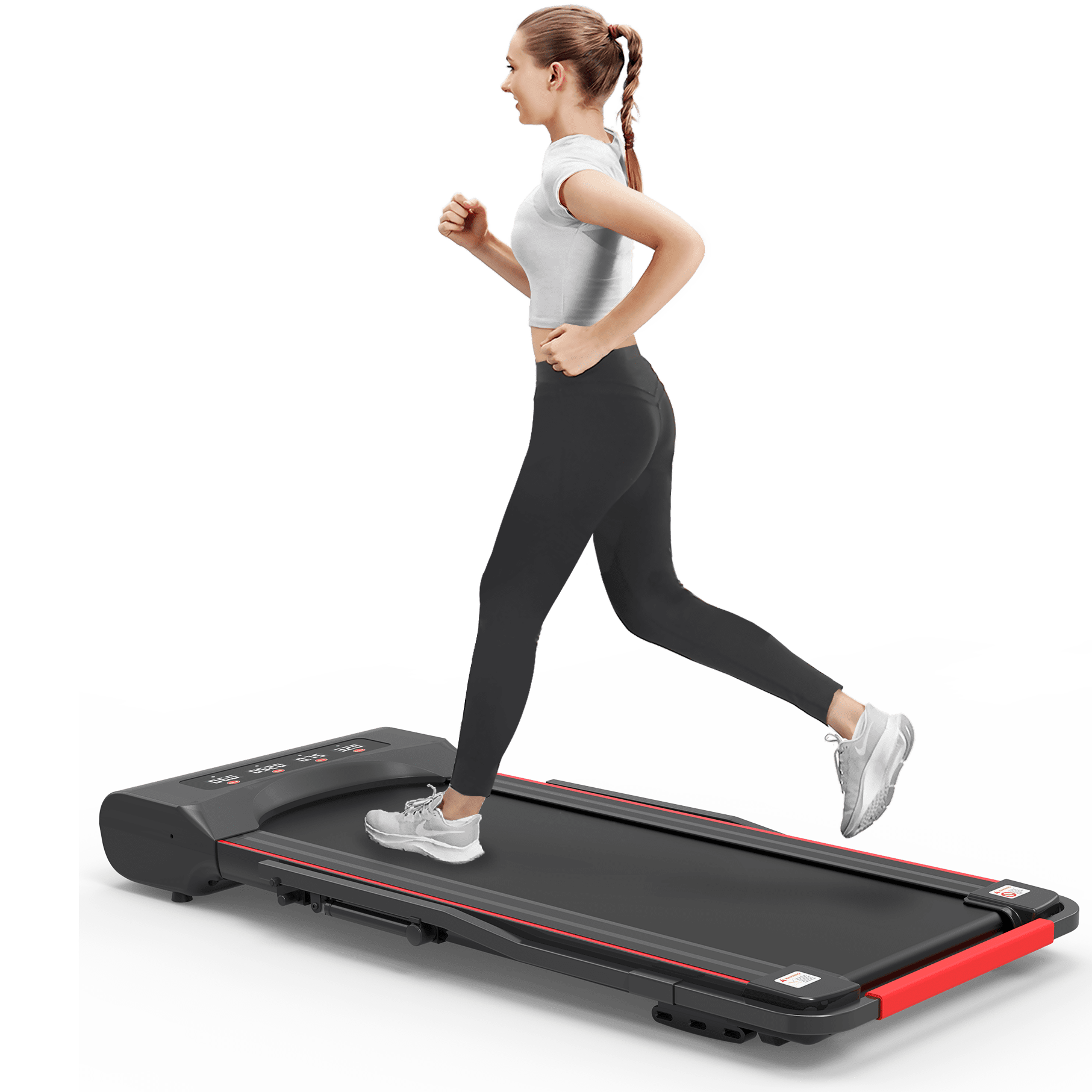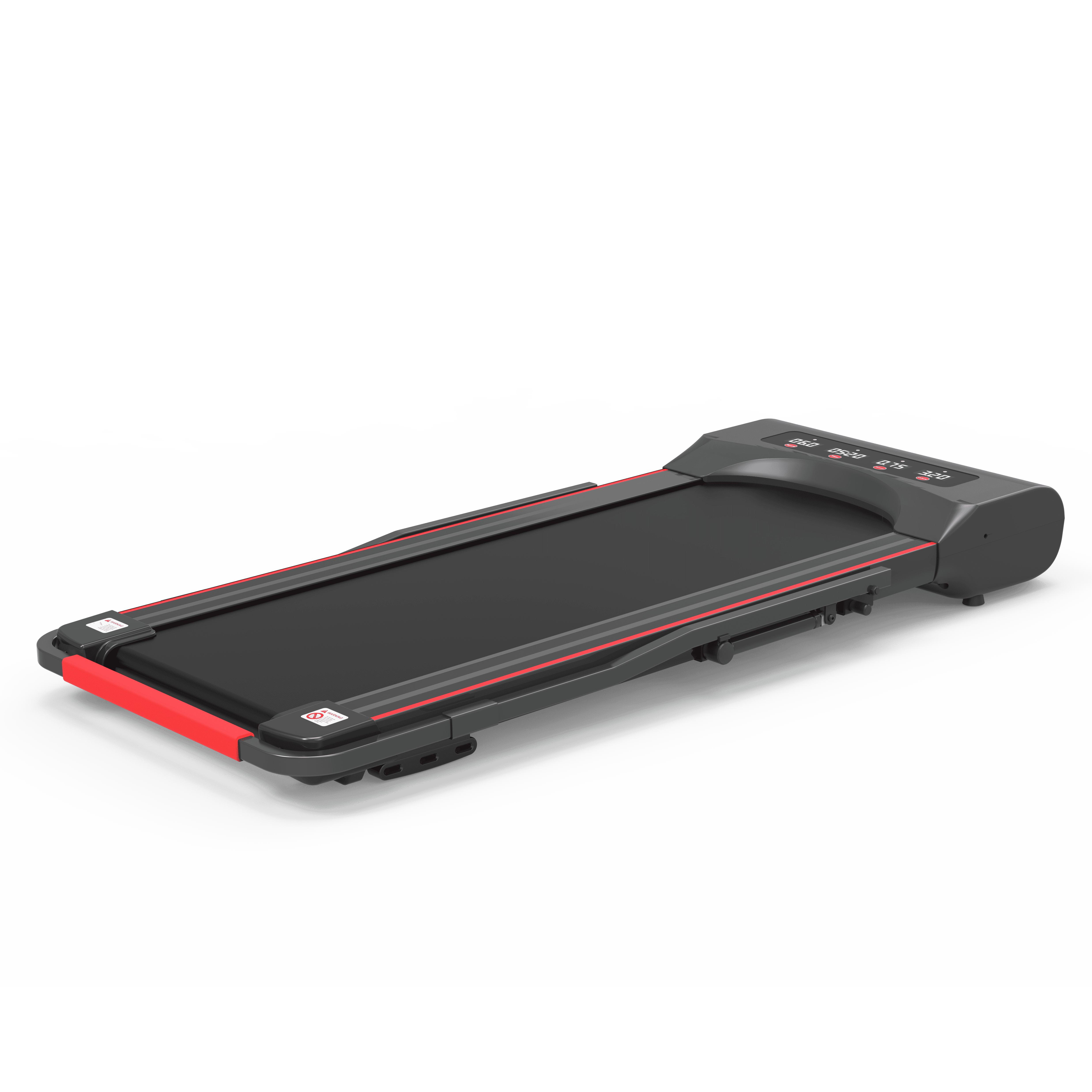 4-window LED DisplayThe progress of speed, distance, time and calories burned can be tracked in 4 big LED windows of the mini treadmill panel at the same time. You can also choose 12 pre-set programs one by one, change the speed or stop the treadmill running in an instant with the smart remote control.
