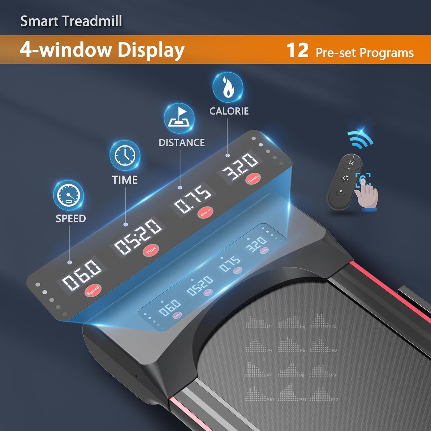 [4-window LED Display]The progress of speed, distance, time and calories burned can be tracked in 4 big LED windows of the mini treadmill panel at the same time. You can also choose 12 pre-set programs one by one, change the speed or stop the treadmill running in an instant with the smart remote control.