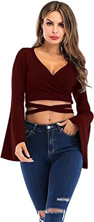 Women's Sexy Tie Up Crop Top Ladies Flared Sleeve Deep V Neck Casual Basic T Shirt Women's Sexy Tie Up Crop Top Ladies Flared Sleeve Deep V Neck Casual Basic T Shirt Women's Sexy Tie Up Crop Top Ladies Flared Sleeve Deep V Neck Casual Basic T Shirt